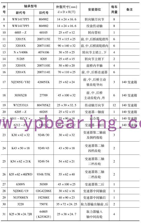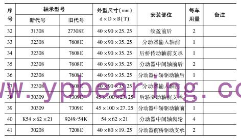 | 18 | 3030X2B | 27709 | 45×100×32 | 前、中、後(hòu)橋主動(dong)齒輪内(nei)、外 | 6 | 140變(biàn)速箱 |